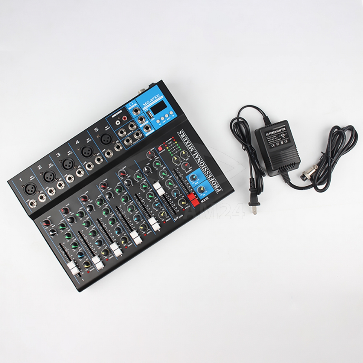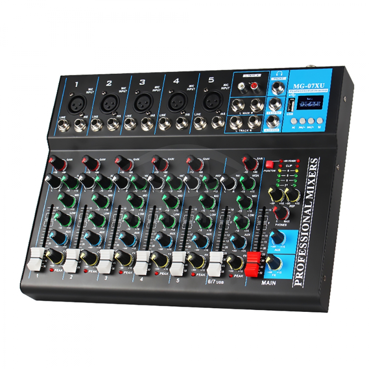 Микшерный пульт 7-ми канальный J.I.Y MG-07XU цифровой подойдет для микрофона, для вокала, для компьютера, для колонок как в условиях студии, так и дома. Звуковой домашний беспроводной микшер громкости с блютузом имеет удобную панель управления с поворотными регуляторами, на которых установлены прорезиненные накладки. Музыкальный микрофонный bluetooth стерео микшер для звука оснащен микрофонными входами, которые защищены от помех и возможных искажений. Всего в аудиомикшере предусмотрено 6 моновходов и 1 стереовход. На каналы подается мощность 48 Вт. Микшерный пульт может использоваться как с микрофонами проводными и беспроводными, так и с телефонами, планшетами и другими устройствами при соединении по блютуз.