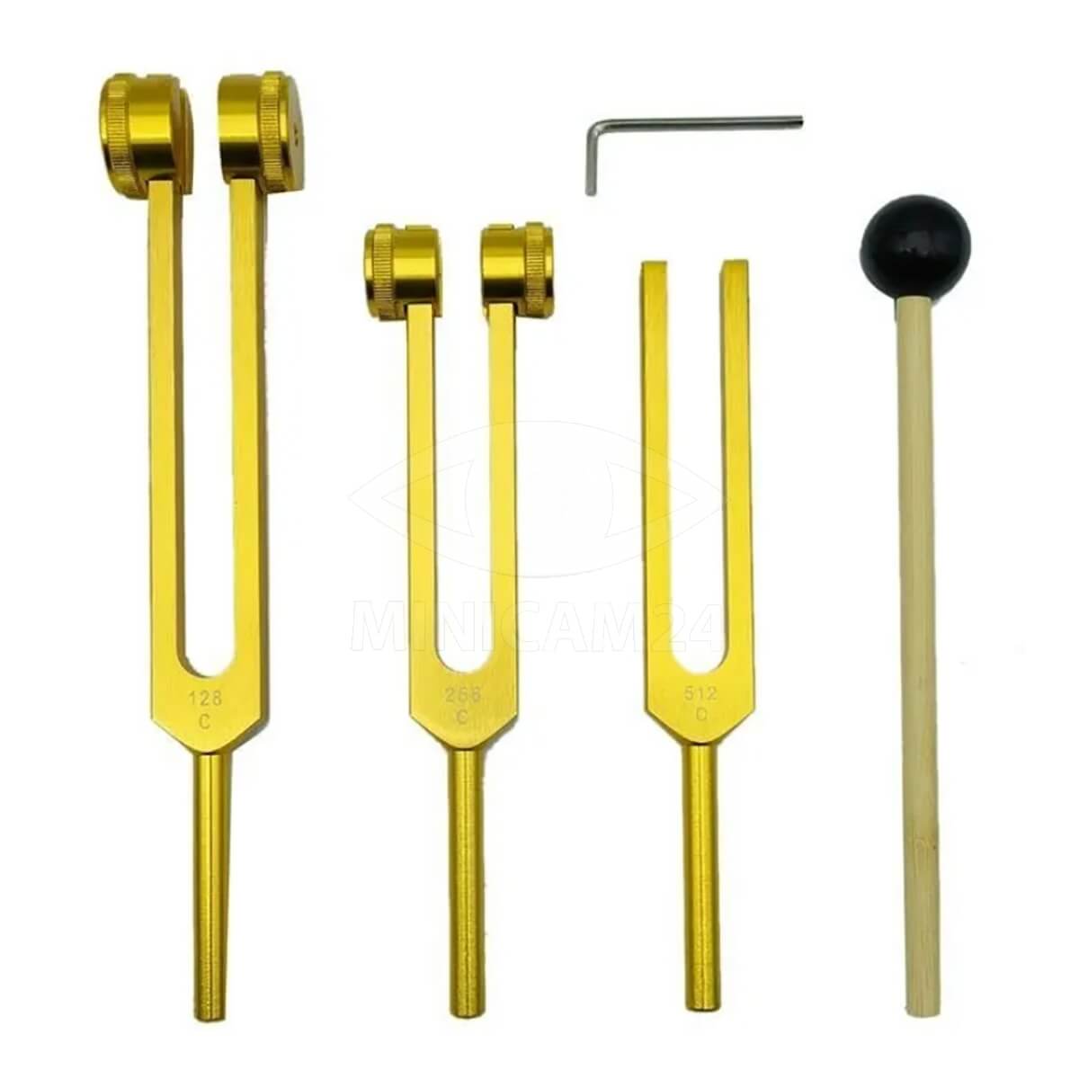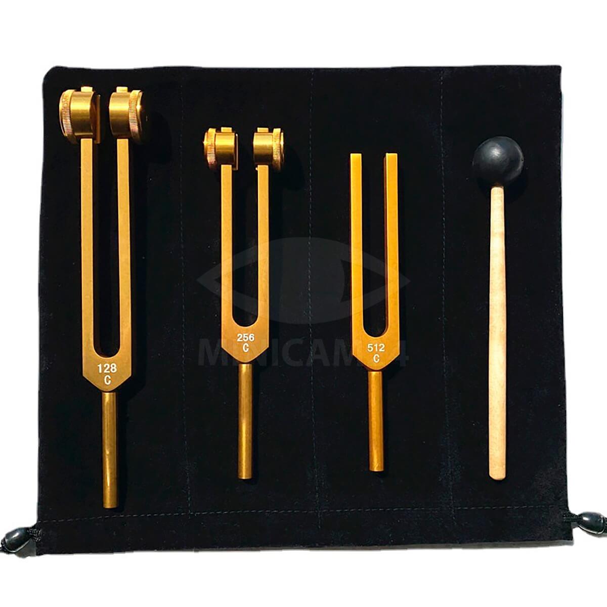 В наборе 3 камертона: 128 Гц, 256 Гц, 512 Гц, камертонный молоток, шестигранный ключ, мешочек для хранения инструментов.